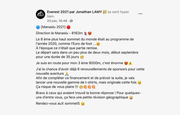 Départ prévu début septembre 2021 pour une expédition de 35 jours. Après l'Everest (8848m) et le Lhotse (8516m) en mai 2021, le Manaslu (8163m) sera le 3ème sommet de plus de 8000m que fera Jonathan Lamy en 2021. Un nouvel exploit...